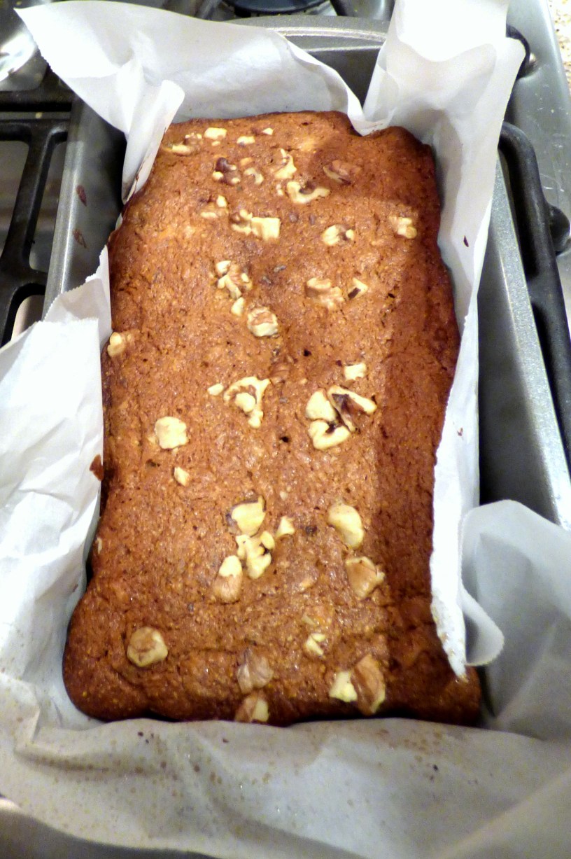 In a stand mixer cream butter and sugar. Combine the rest of the wet ingredients together. Then fold wet ingredients into dry ingredients just until moist. It’s ok if there are lumps. If you wish to add walnuts then you may add those as well. I like to keep a few to place on the top of the batter before placing in the oven.