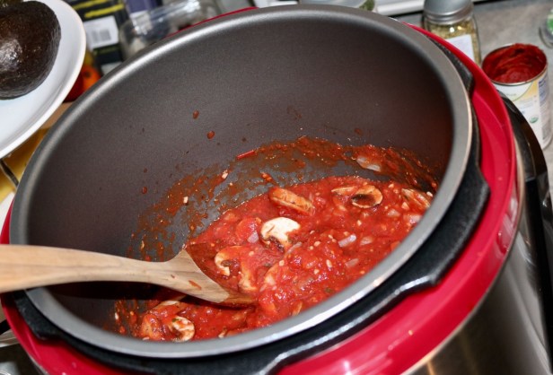 While you’re waiting on the water cut up your veggies and herbs. I love to use fresh herbs if I have them. My favorite things to put in my sauce are garlic, onion, mushrooms, oregano, basil, pepper, salt, a tiny bit of sugar, and of course tomatoes. Personally, I like to turn on my pressure cooker and put in a tablespoon of olive oil and let my garlic and onions simmer a bit. Then add in the rest of your ingredients and seal up your cooker.